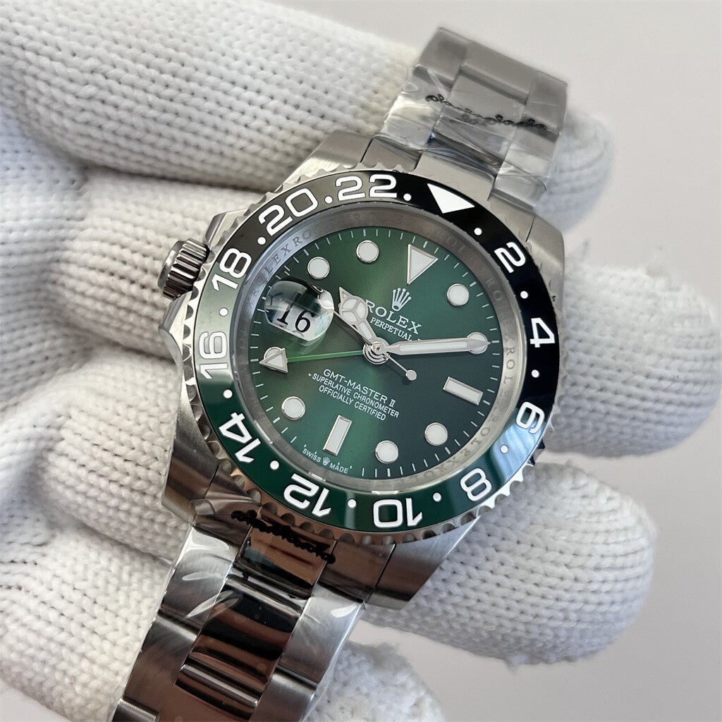 • Green dial (Rolex signature sunburst green) • GMT function with green GMT hand • Black/green 24-hour bezel • Stainless steel Oyster bracelet • Crown on the right side (standard GMT layout)