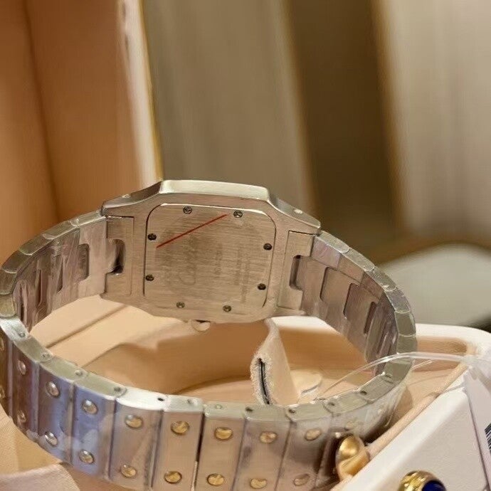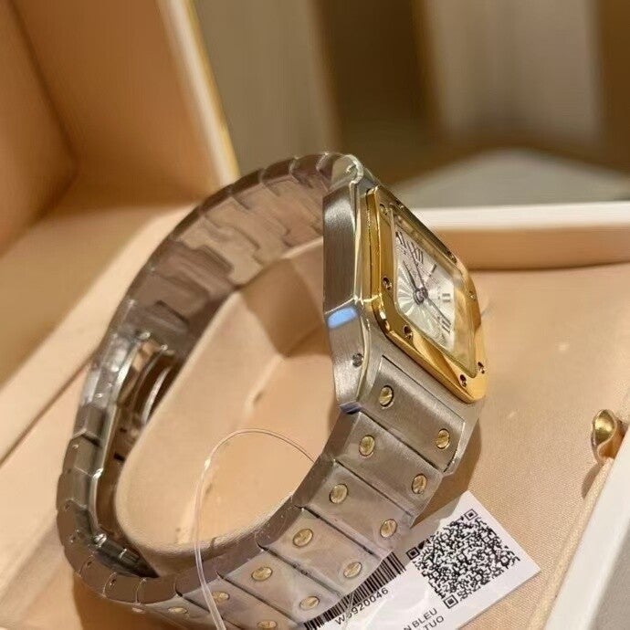 This ladies two-tone Santos Galbée pairs stainless steel with yellow gold detailing for a classic luxury finish. The smaller square case, Roman numeral dial, and slim profile make it an ideal choice for elegant daily wear or formal occasions.