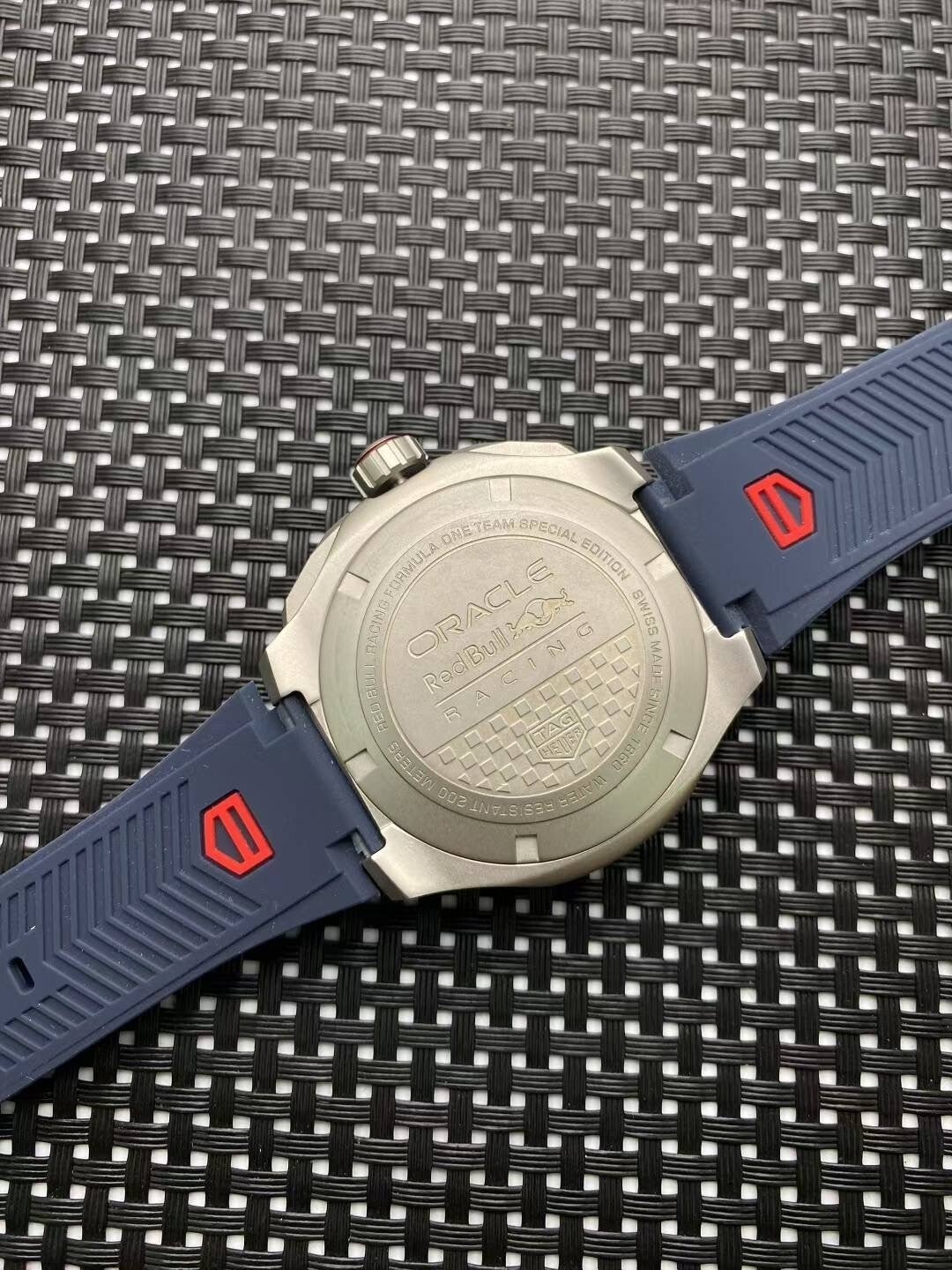Black dial with carbon-style texture and red chronograph accents. Aggressive racing aesthetic.